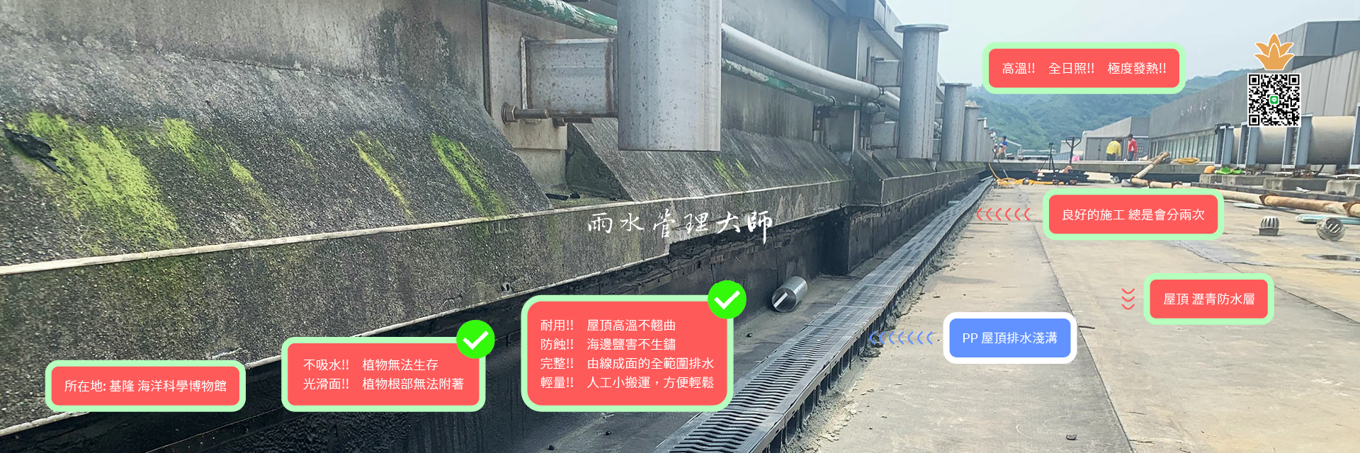 一般屋頂以點排水型式收集屋面雨水,使用PP水溝後可將傳統點排水方式進步為線排水方式,避免堵塞或淤積於單點造成積水進而產生屋頂滲漏等問題。