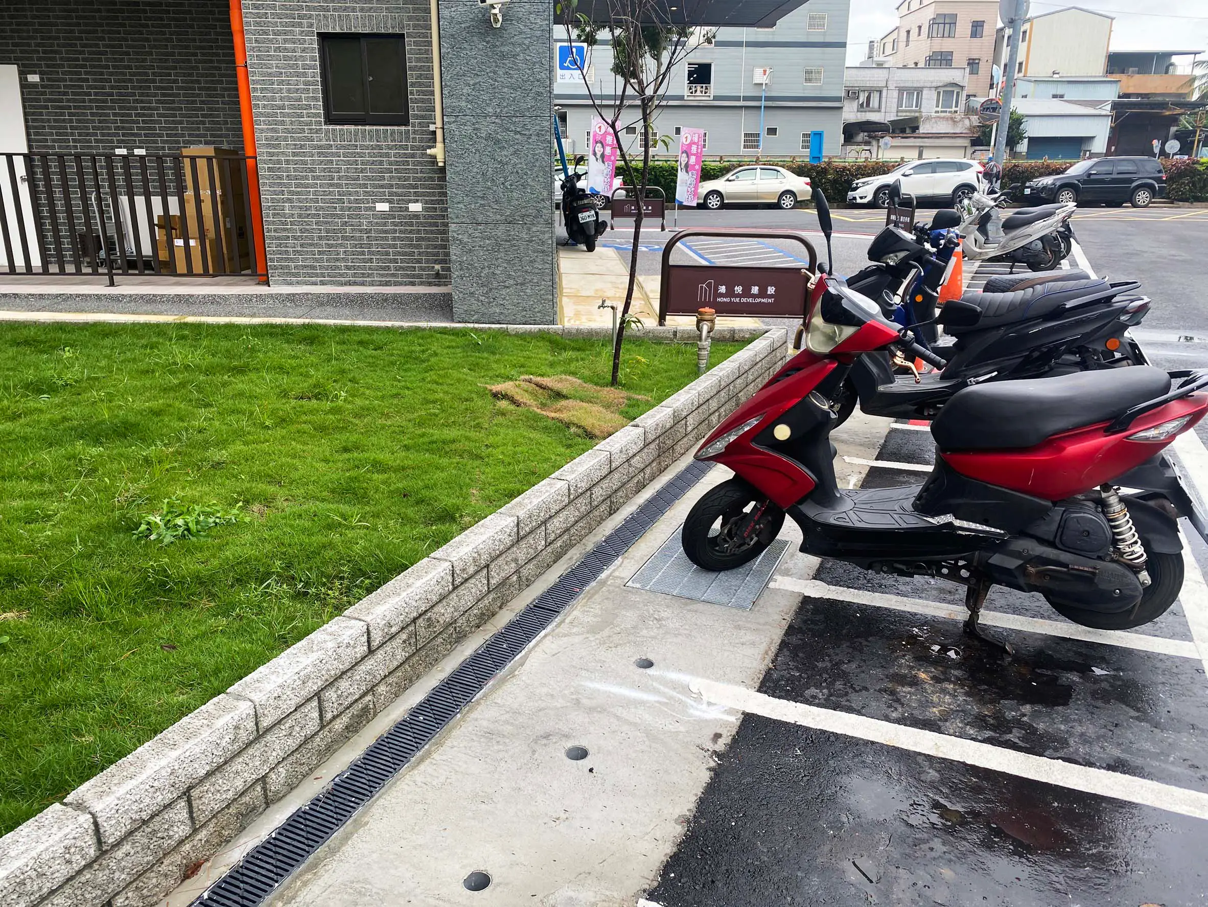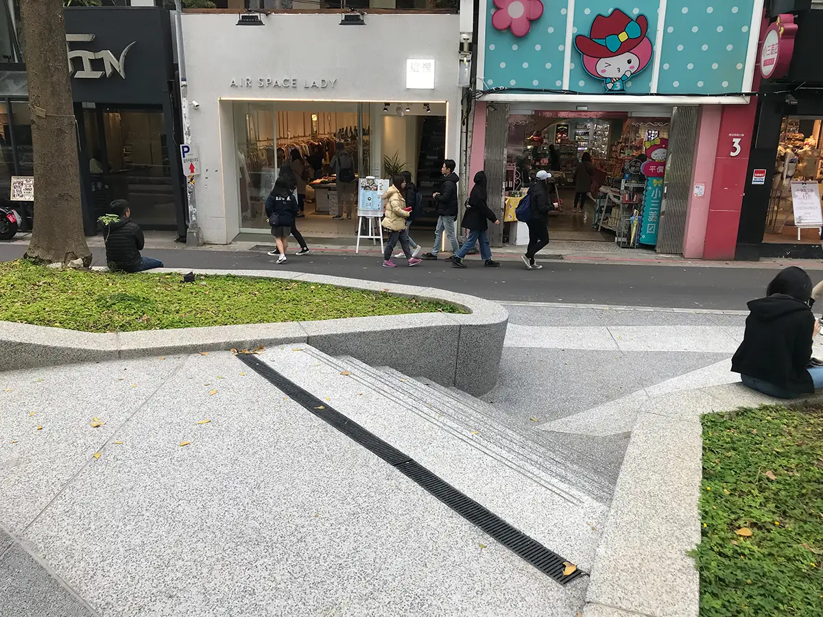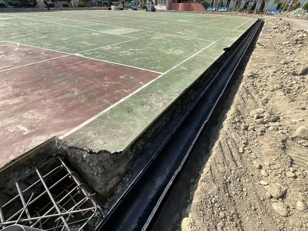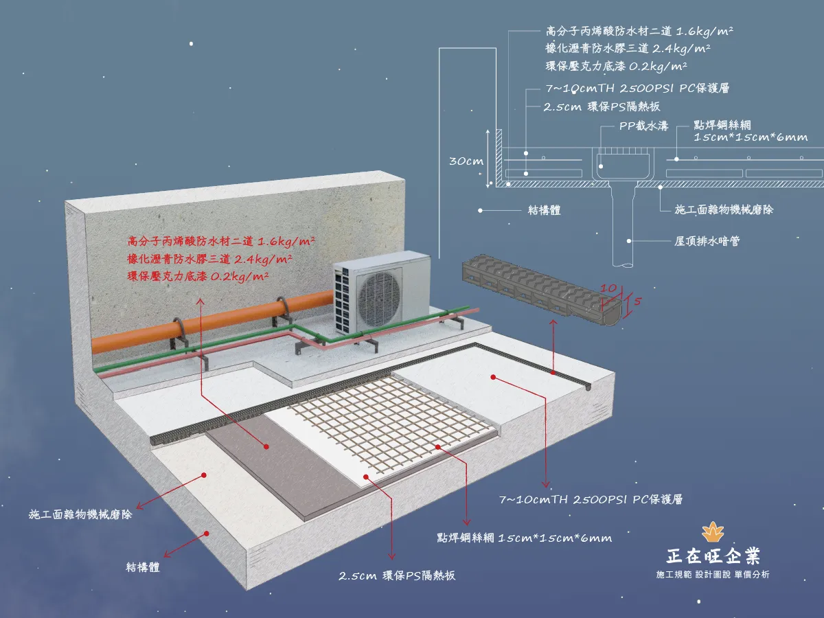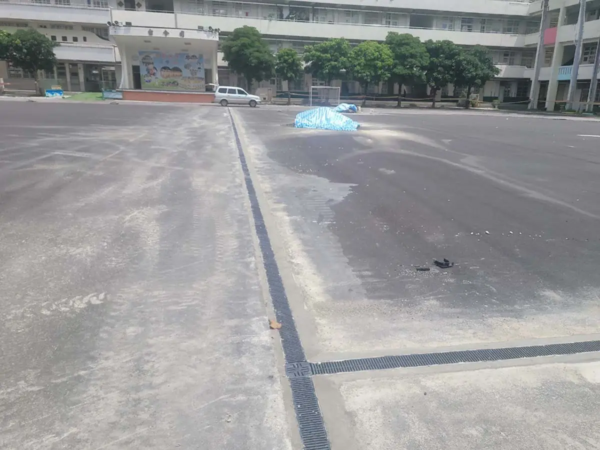 後改以淺型PP截水溝施作線型排水解決上述問題,本案有7處屋頂,單坡斜,雙坡斜,四方斜等施工法均有使用。
