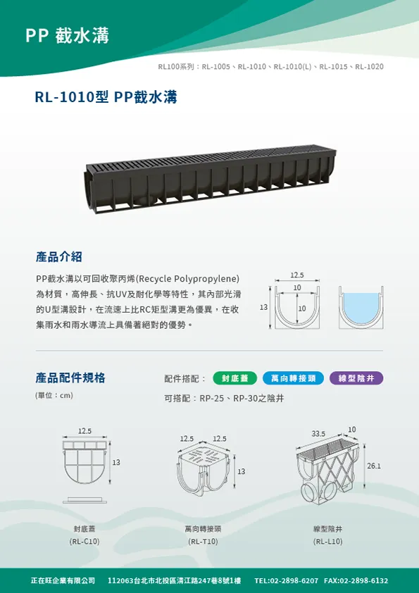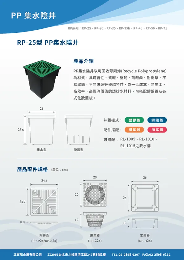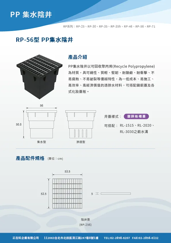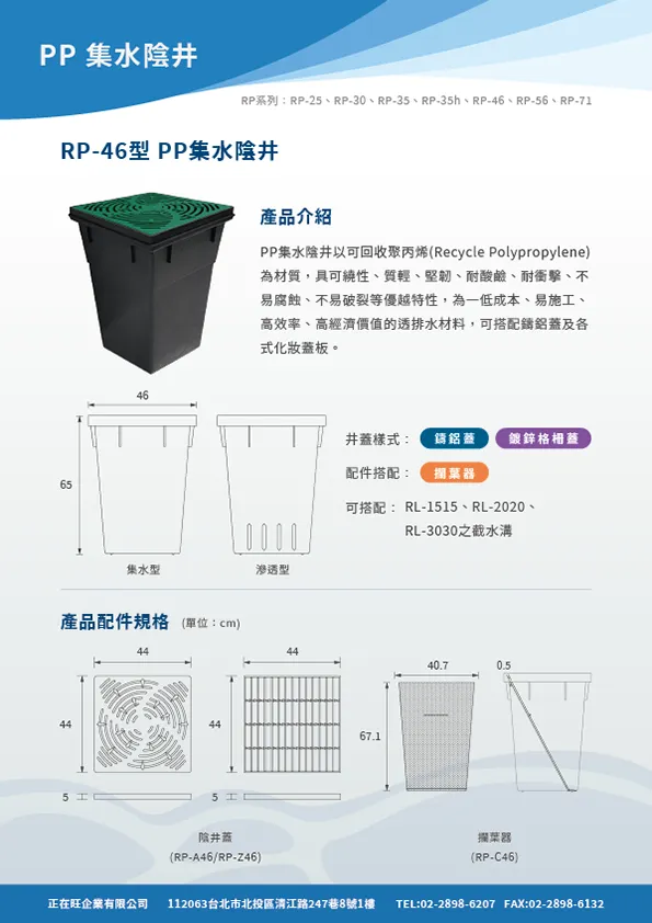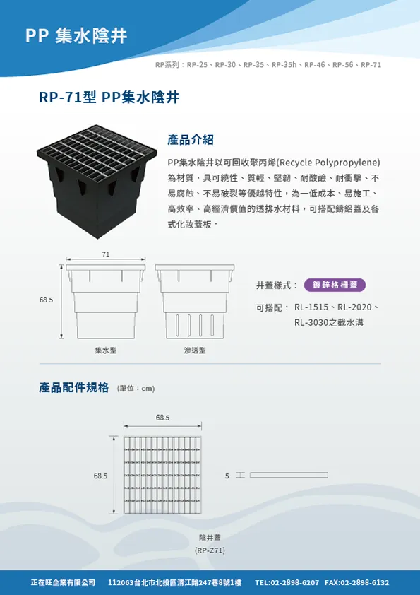 本頁內容附有PP截水溝,PP集水陰井,PP滲透陰井之型錄等相關詳細資料,在02601章排水管溝也附有網路所擷取之內容供參。在明溝排水部分也附有10型PP截水溝之圖說及相關預算,各型式陰井的圖說也附錄於此供客戶使用。
