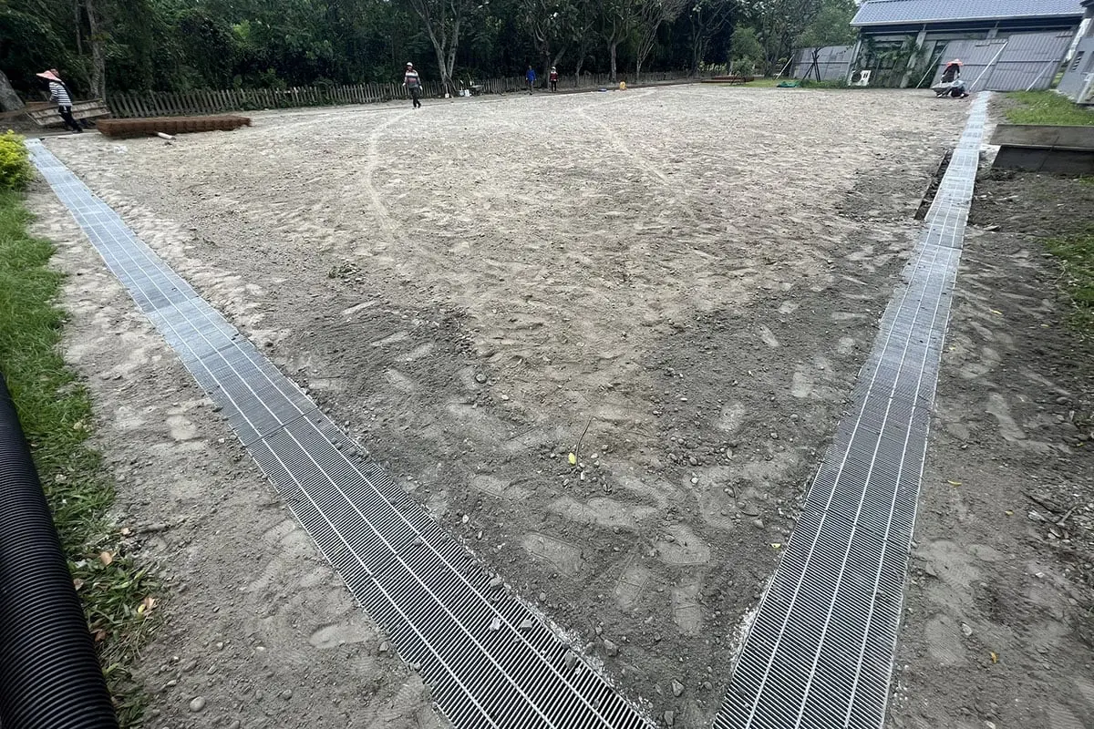 PP預鑄截水溝用於暗溝施工時應於夯壓原土層後鋪設防沉陷網,鋪設後使用粗砂且加入適當水分壓實並以鏝刀或整平尺整平,如無特殊需求PP暗溝側邊均可以原有土壤回填後夯壓密實至溝頂後,依完成面需求使用原土繼續回填後鋪上瀝青或鋪設點焊鋼絲網後進行灌漿等後續工作。