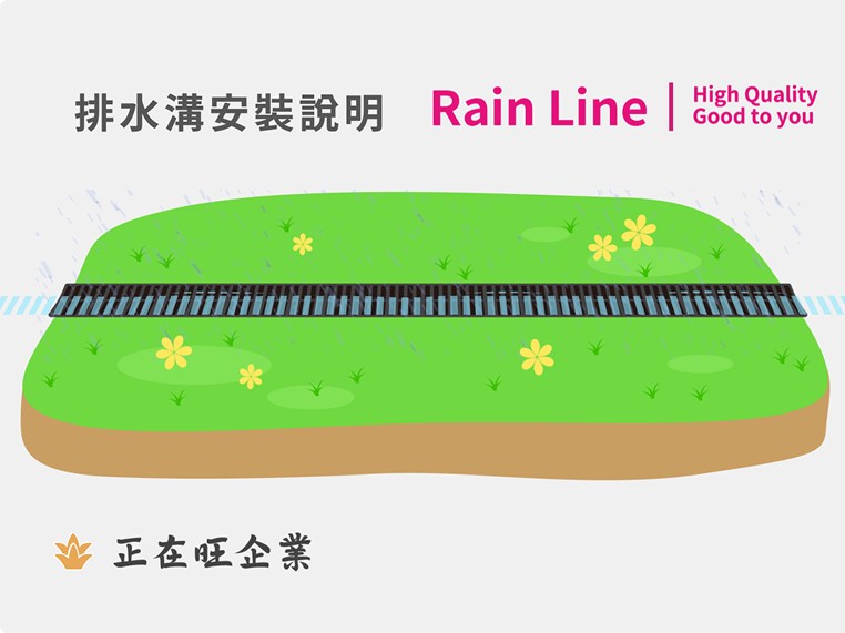 Rain LINE 預鑄線型溝採100%回收料製作,為一種可塑性高,易於切成任何尺寸,質量輕、易於搬運、易於調整的一種新型地面排水溝材料。使用PP截水溝可省去綁鋼筋、裝拆板模等實際衍生成本與間接等待養護、運輸成本。聚丙烯輕型截水溝適合用於商用空間排水、公共空間排水、景觀空間排水、屋頂排水、山坡邊溝排水及體育館運動場排水。