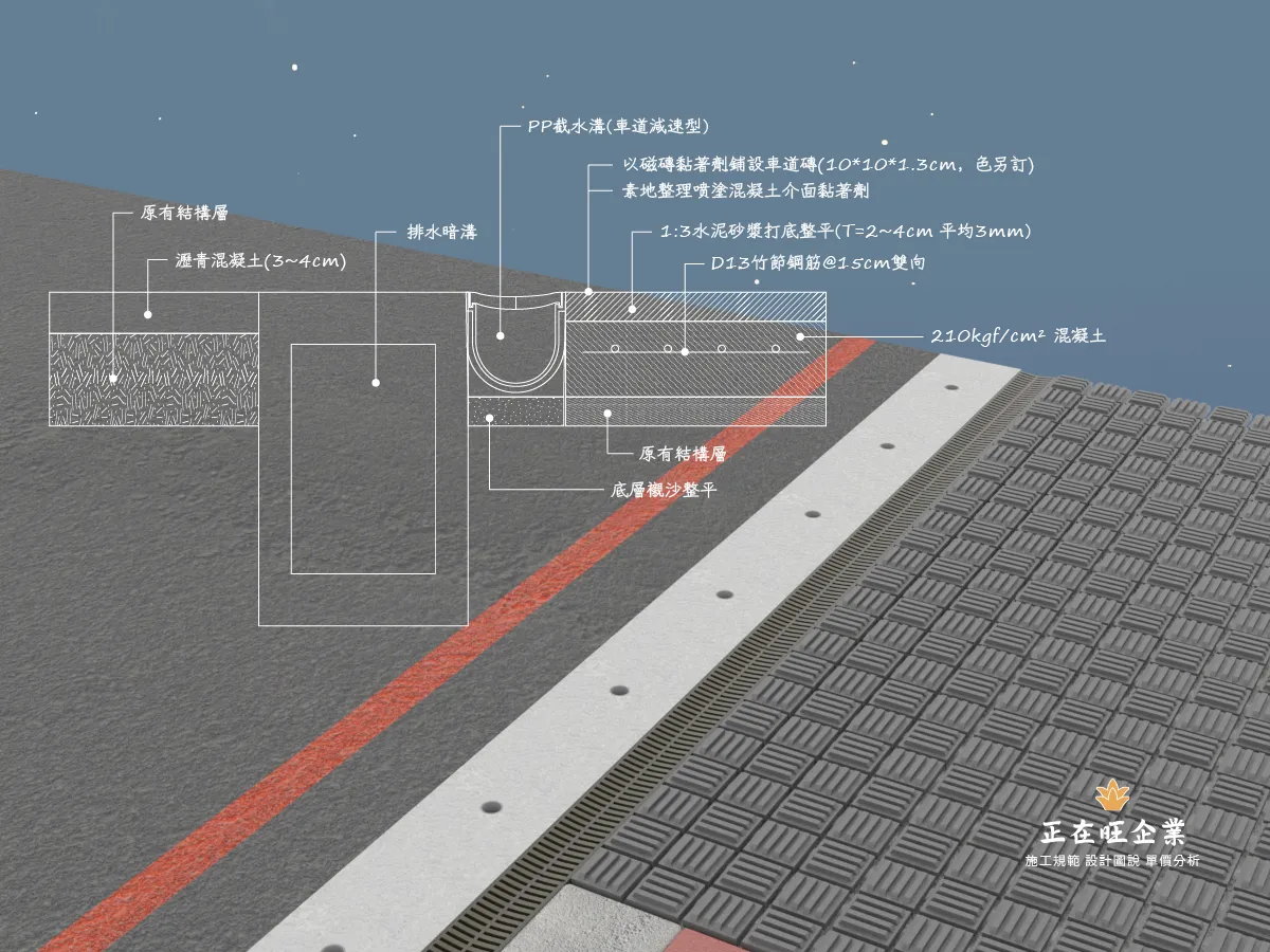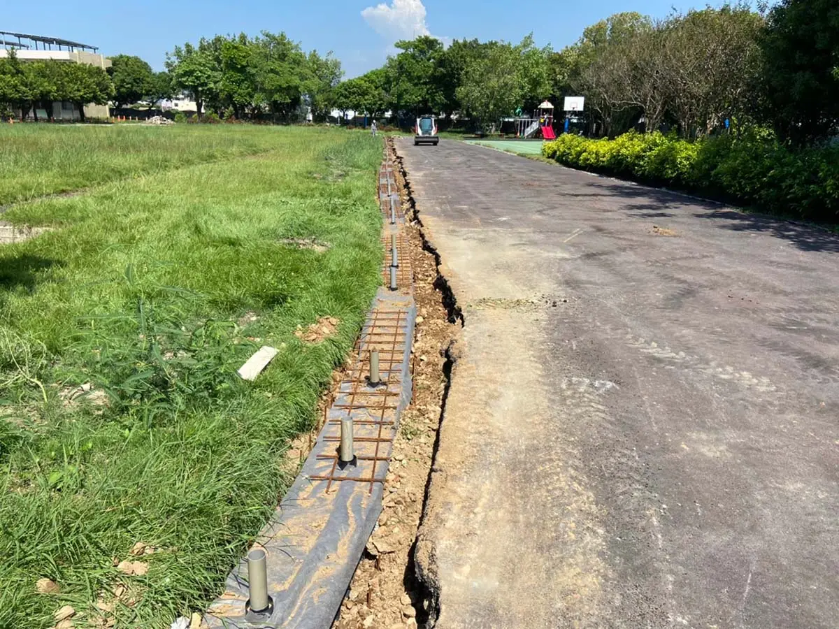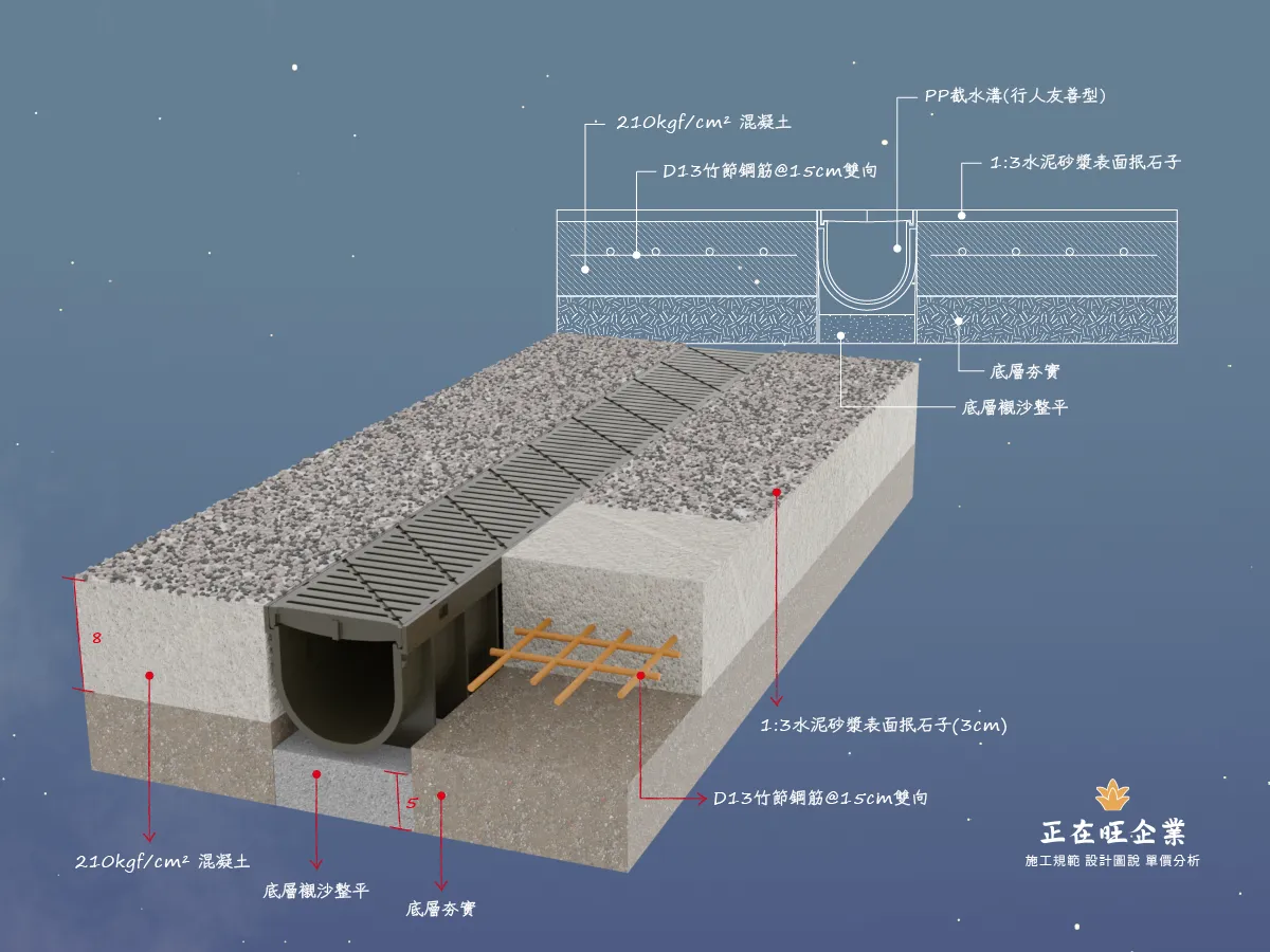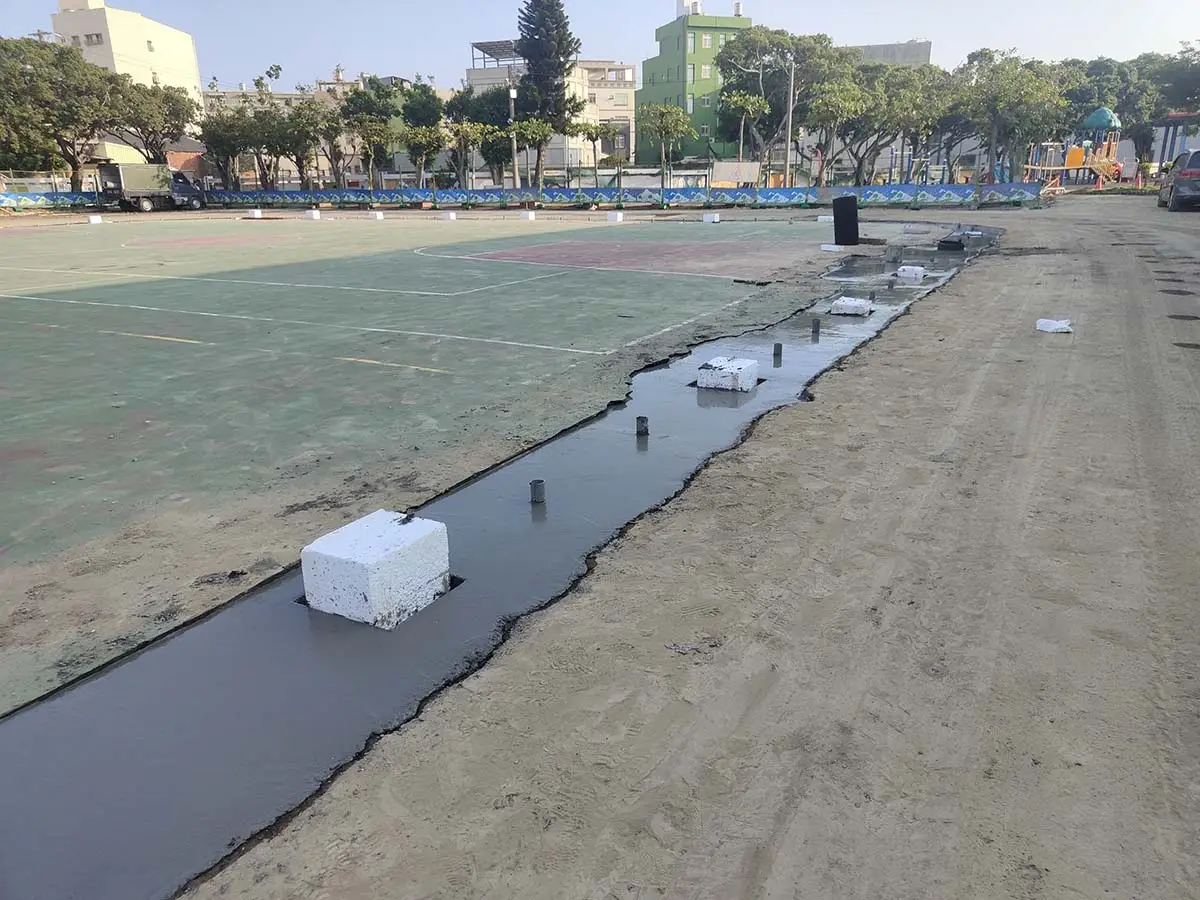 後改以淺型PP截水溝施作線型排水解決上述問題,本案有7處屋頂,單坡斜,雙坡斜,四方斜等施工法均有使用。