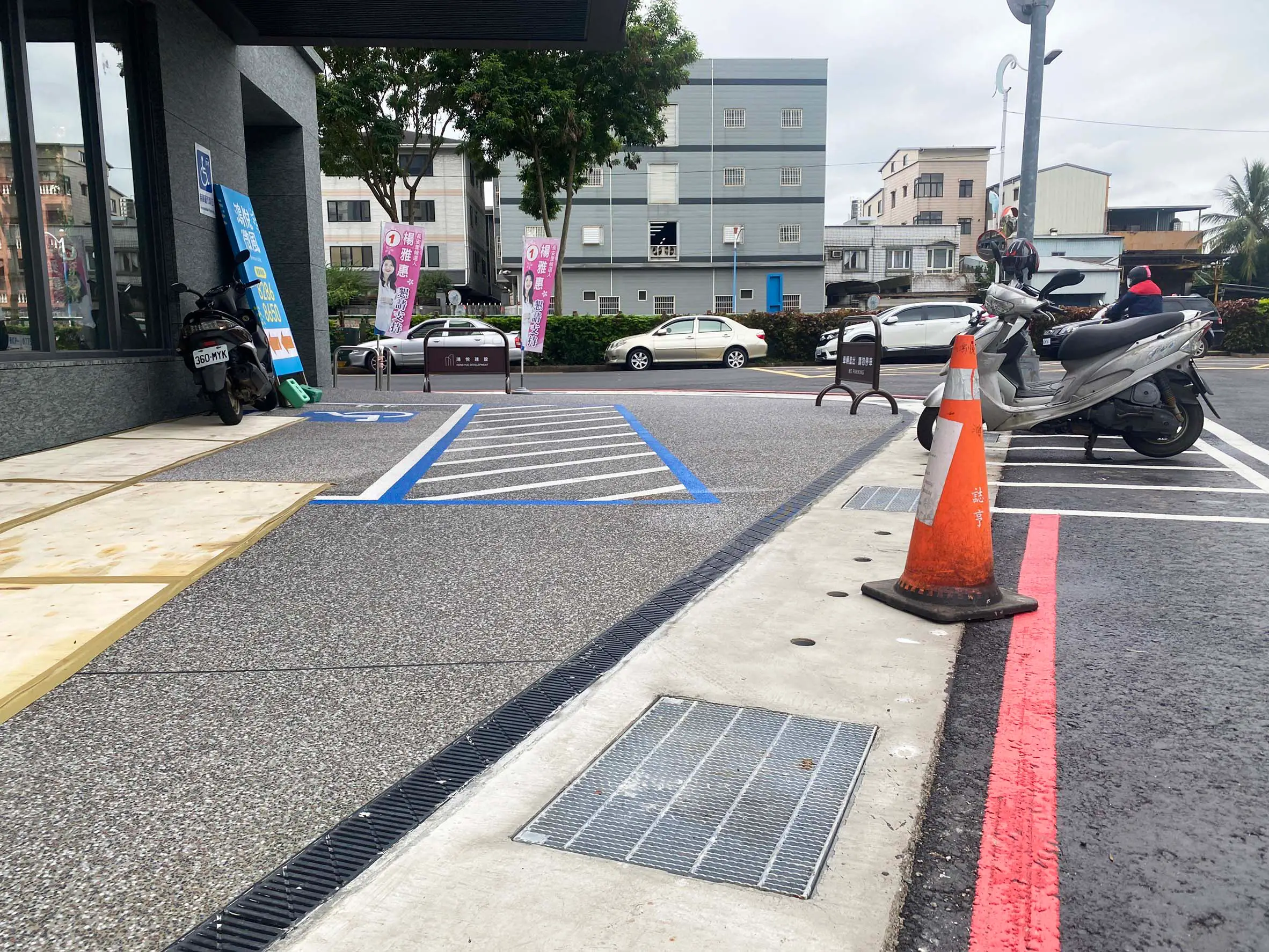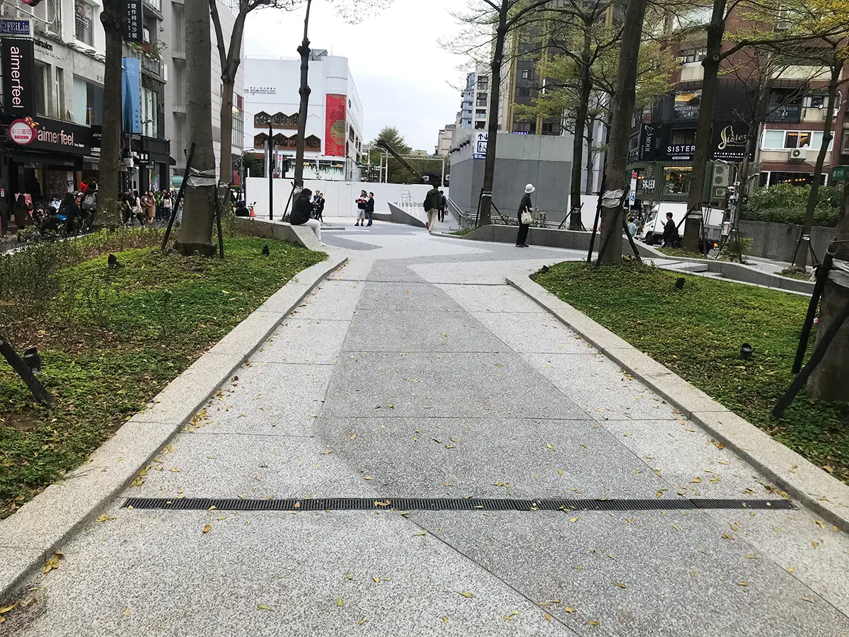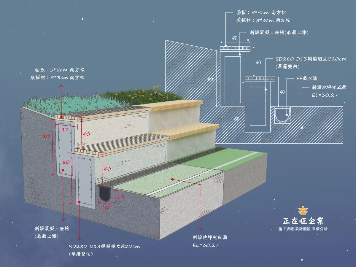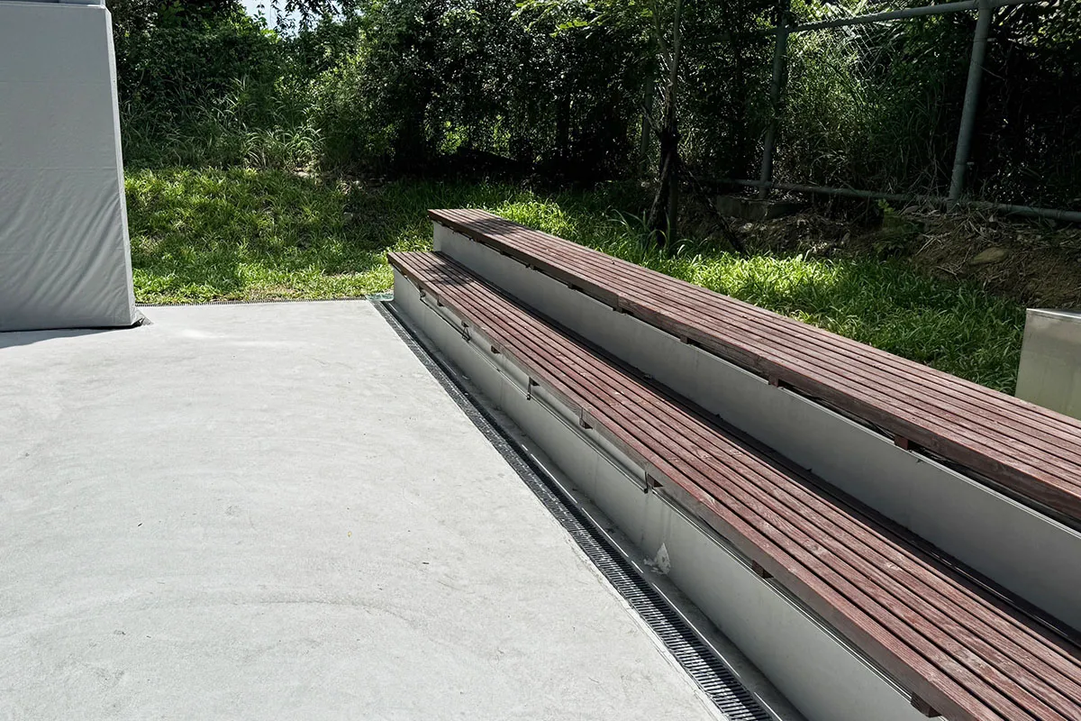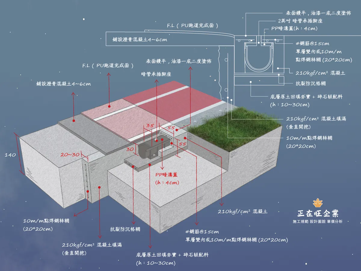 後改以淺型PP截水溝施作線型排水解決上述問題,本案有7處屋頂,單坡斜,雙坡斜,四方斜等施工法均有使用。