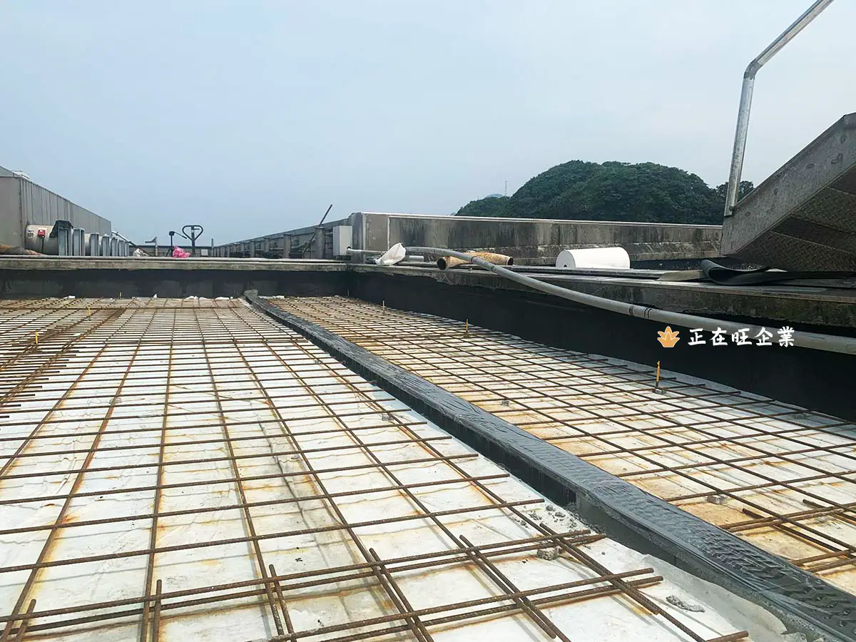 本案為基隆望海巷漁港潮境公園旁的海洋科技博物館屋頂,原本屋頂使用落水頭點狀排水,因位於海邊長期鹽害,落水頭雜草叢生,植物根系沿排水管及落水頭周圍的保護層生長,導致屋頂排水失靈,防水失效。