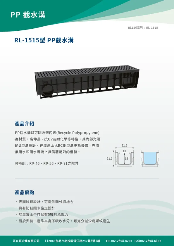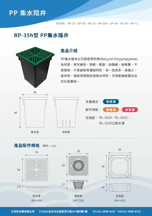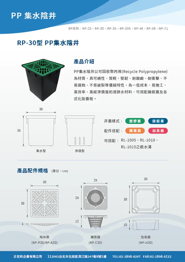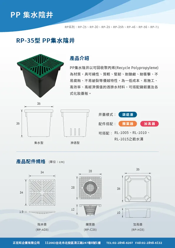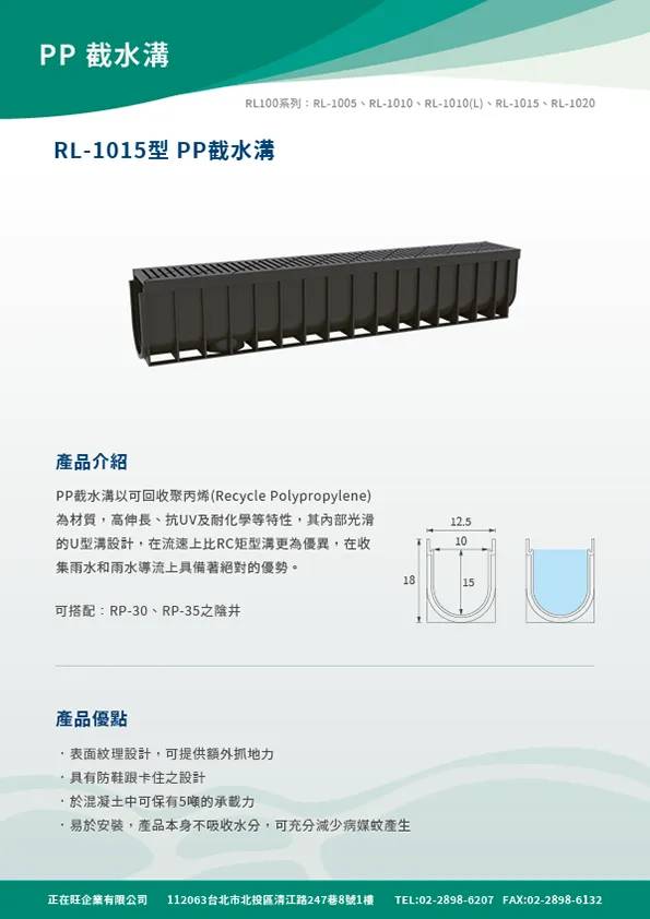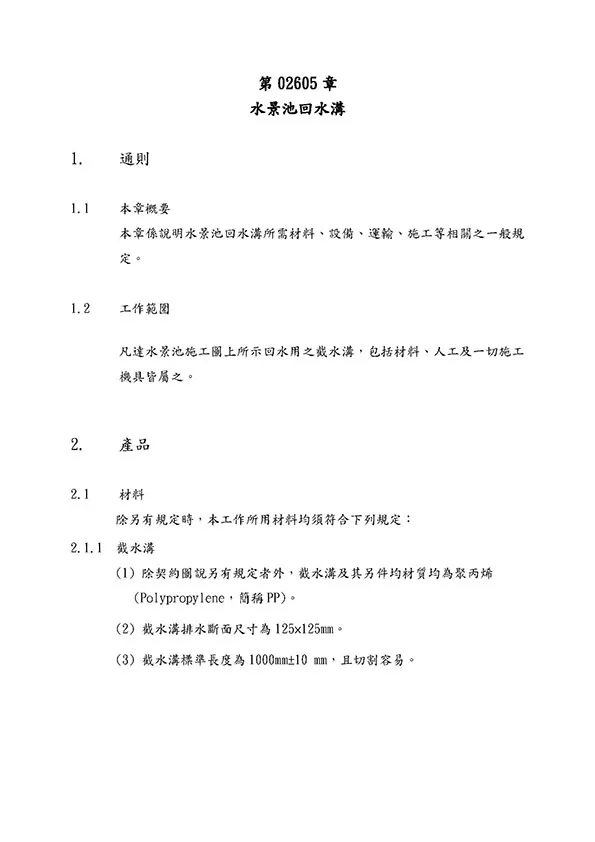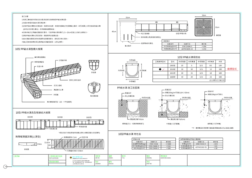 本頁內容附有PP截水溝,PP集水陰井,PP滲透陰井之型錄等相關詳細資料,在02601章排水管溝也附有網路所擷取之內容供參。在明溝排水部分也附有10型PP截水溝之圖說及相關預算,各型式陰井的圖說也附錄於此供客戶使用。